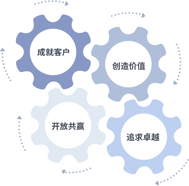 成就客户是一切决策的出发点,,,,创造价值是衡量所有工作的标准,,追求卓越是我们做事做人的态度,,,开放共赢是我们的格局也是最终的结果。。。。价值观的齿轮环环相扣,,,推动着组织里的每个人不断向前。。